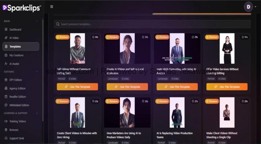 - DFY Niches: No Thinking, Just Creating – Select your niche and SparkClips AI pre-loads the perfect design layouts, color palettes, font pairings, and use-case flows for it.