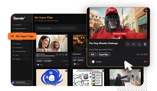 - SuperclipsAI is the world’s first “All-In-One” Generative Video Studio that turns simple ideas into broadcast-ready commercials, viral shorts, and cinematic stories in seconds. It writes the script. It directs the scene. It generates hyper-realistic video footage. It casts the actors. It even adds professional voiceovers and music.
