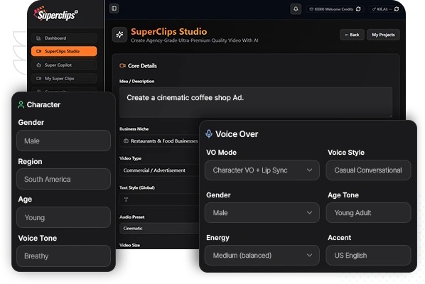 - The SuperClips Studio-Think of this as your personal, 24/7 film crew living inside your browser. It replaces the scriptwriter, the director, the camera operator, the casting agent, and the sound engineer. You act as the Visionary, type your idea, and the engine coordinates every aspect of production (Script, Visuals, Voice, Music) to deliver a broadcast-ready masterpiece in seconds.