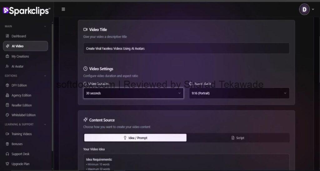 In the first step, you have to type your idea and upload your images. This AI builds the full script, hook, title, and visuals for you.
